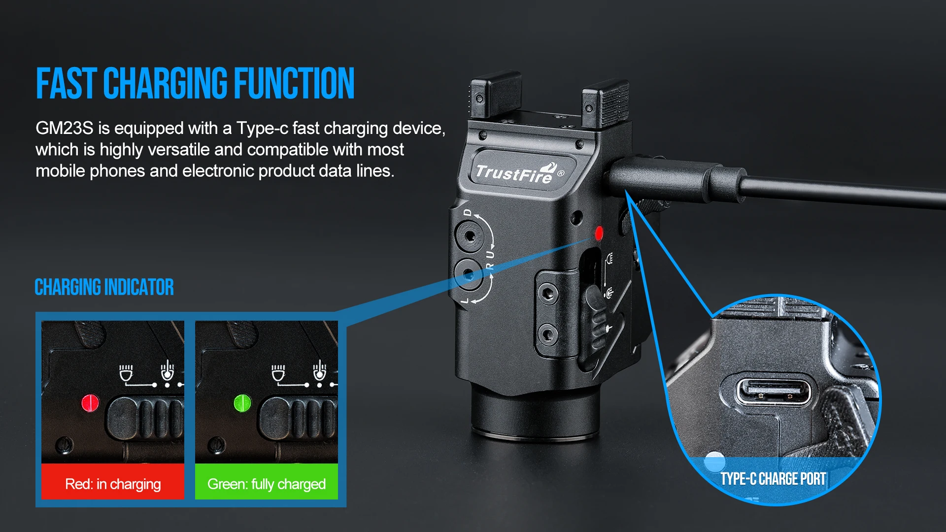 TrustFire GM23S is a small rechargeable tactical flashlight designed for outdoor sports. GM23S innovatively incorporates mechanical three-mode and electronic three-mode gear design. Mechanical three-mode contains: white light mode, green laser + white light mode, green laser mode; electronic three-mode contains: daily mode, economy mode and transport lock mode. with high reliability and stronger operability,Max up to 800 lumens, with intelligent temperature control and low-voltage warning, built-in rechargeable lithium ion battery; IP64 dust-proof and waterproof and pass 1 meter anti-drop, it can use safely in the outdoor environment.